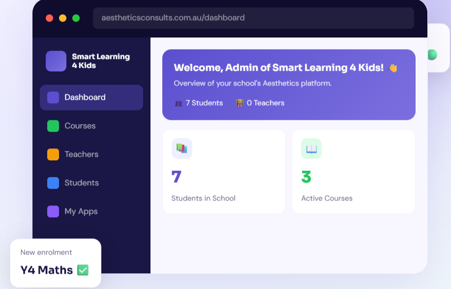 Manage courses, teachers, students and live classes — all in one place. Smart Learning 4 Kids empowers Australian educators with a full learning ecosystem.