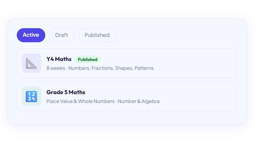View and manage all courses across your school. Filter by status (Active, Draft, Published, Paused), browse by grade and subject, and add new courses instantly