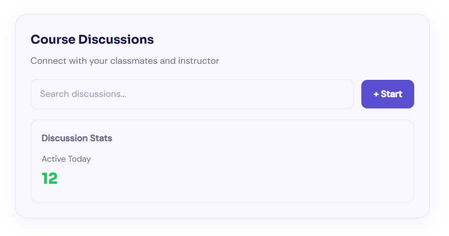 A built-in discussion board for every course. Students and teachers connect, ask questions and collaborate. Track total discussions, replies and daily engagement stats at a glance