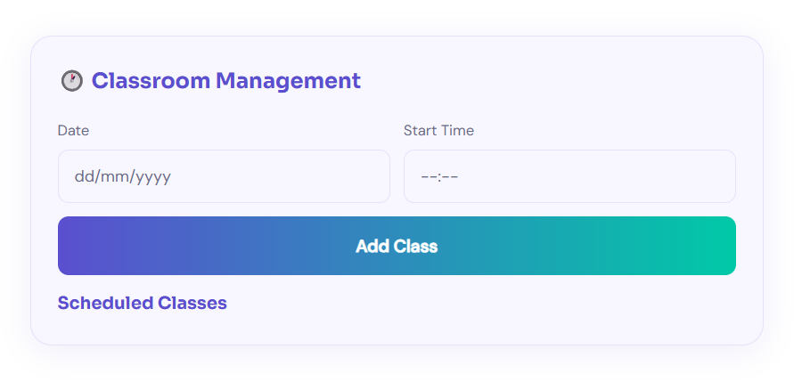 Teachers can schedule live classes directly within each course via the Classroom Management tab. Set a date, start time, end time, topic and class type. All scheduled classes are listed in one organised view.